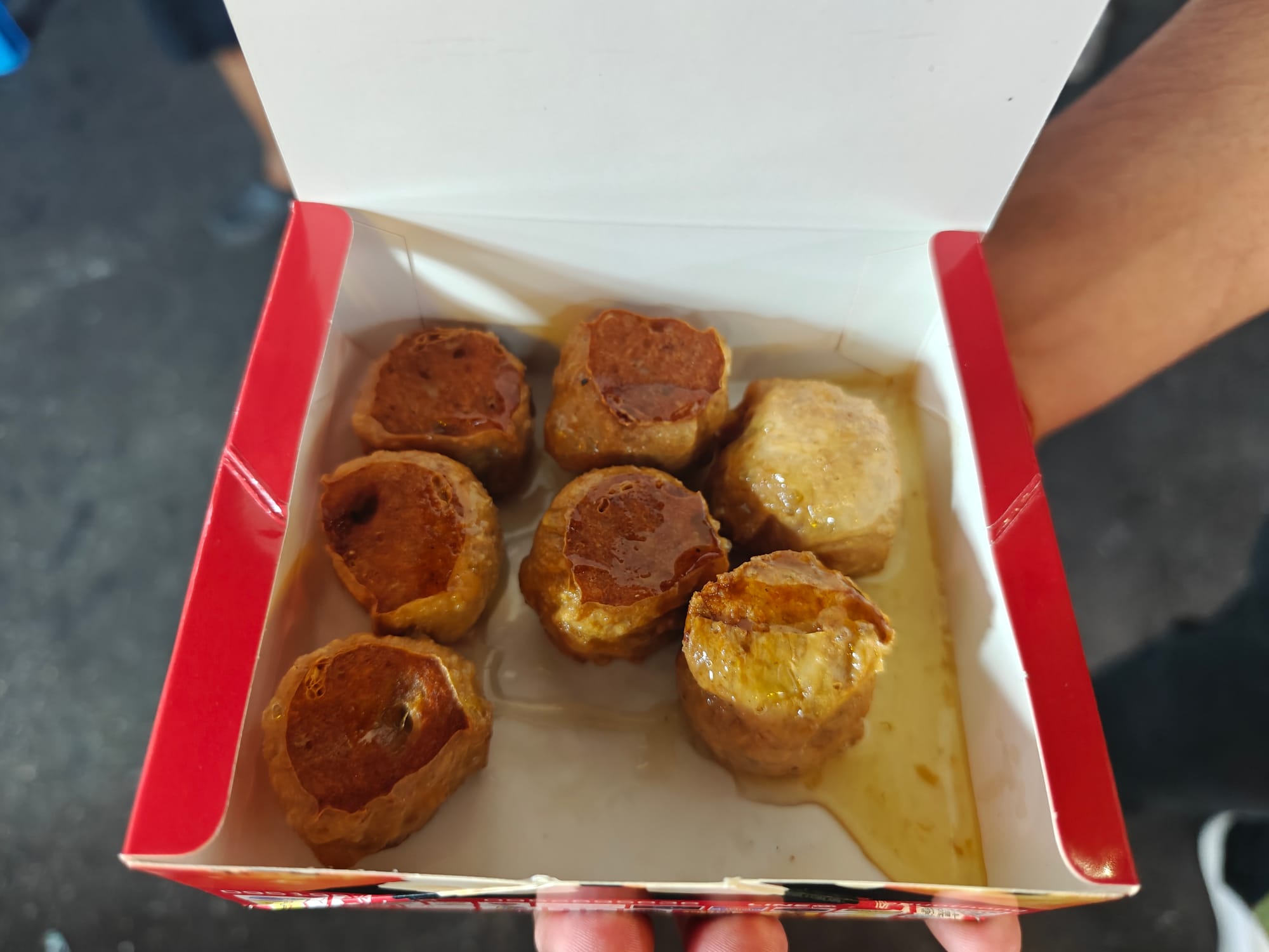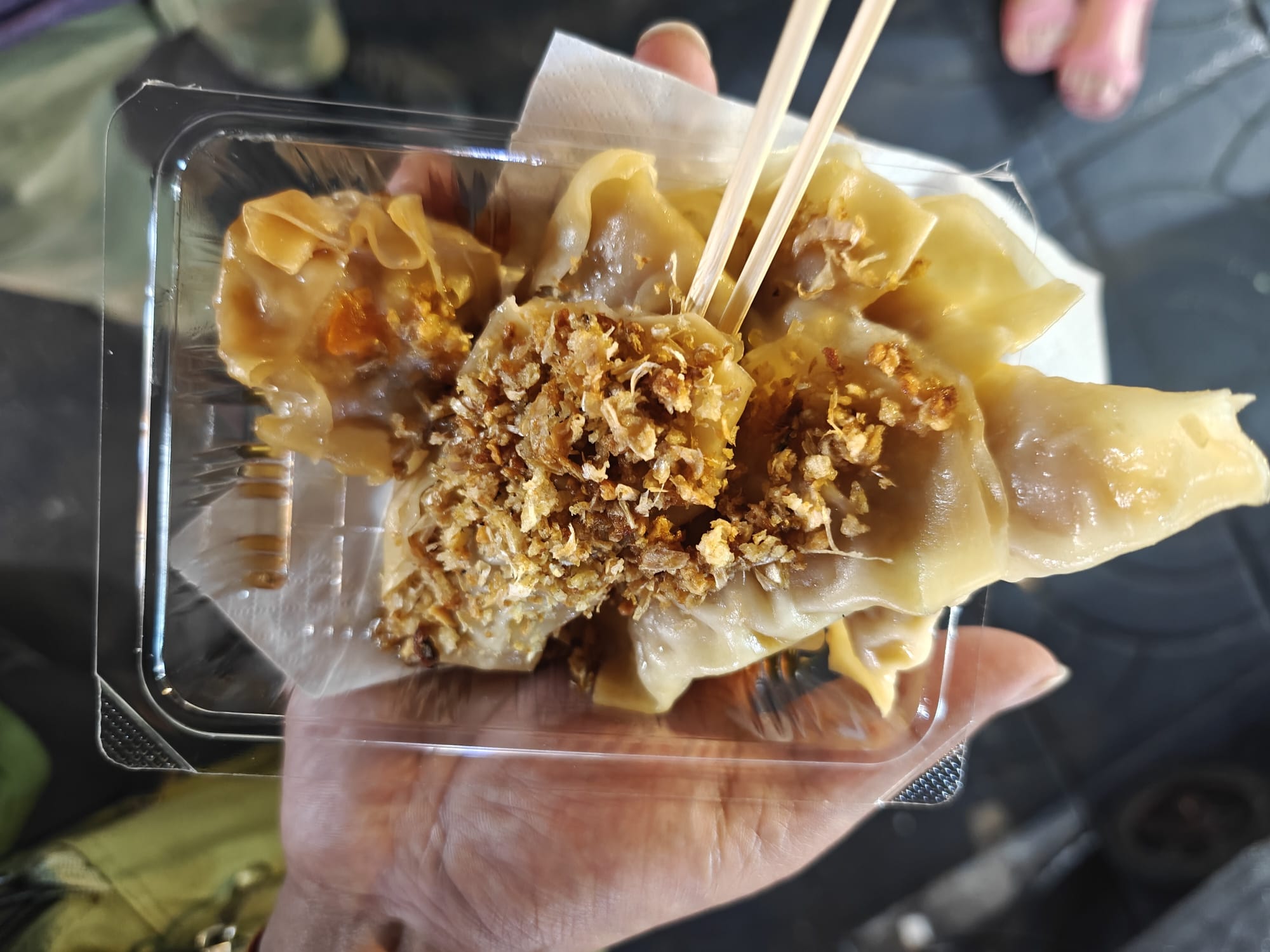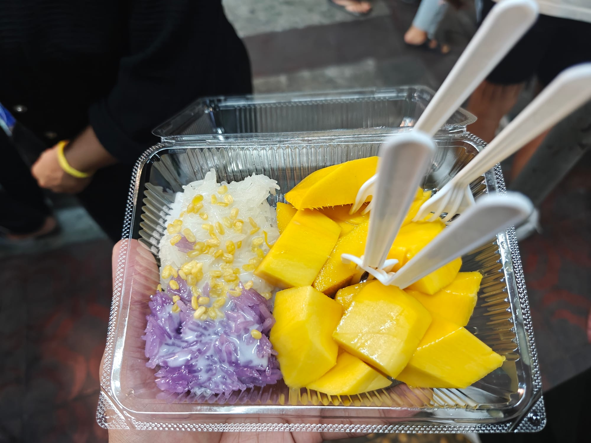 Amidst the heavy Bangkok evening traffic, we struggled to get a ride until we finally secured one after about thirty minutes of waiting through the Bolt service. I was not a fan of the service, as the toll expenses were not accounted for in the final billing, thus resulting in us having to pay for them separately. What I was a fan of, though, was the taxi driver assigned to us, as the cheerful person did not let the piling traffic and the linguistic barrier prevent him from having a friendly chat with us. With the use of Google Translate, he graciously helped us plan our course and described what we could expect in Bangkok Chinatown. And he could not have been more right - because when we got off the Bolt ride, the view of the neon filled, slightly humid hustle and bustle of Chinatown was a scene that nothing could even compare to. Weaving through the visitor crowd at the periphery, our first stop was, of course, a stall selling the world-famous Mango Sticky Rice for just 100 Thai Baht per plate. We finally got to experience firsthand just how true the people were who sang nothing but praises of this exclusive snack!