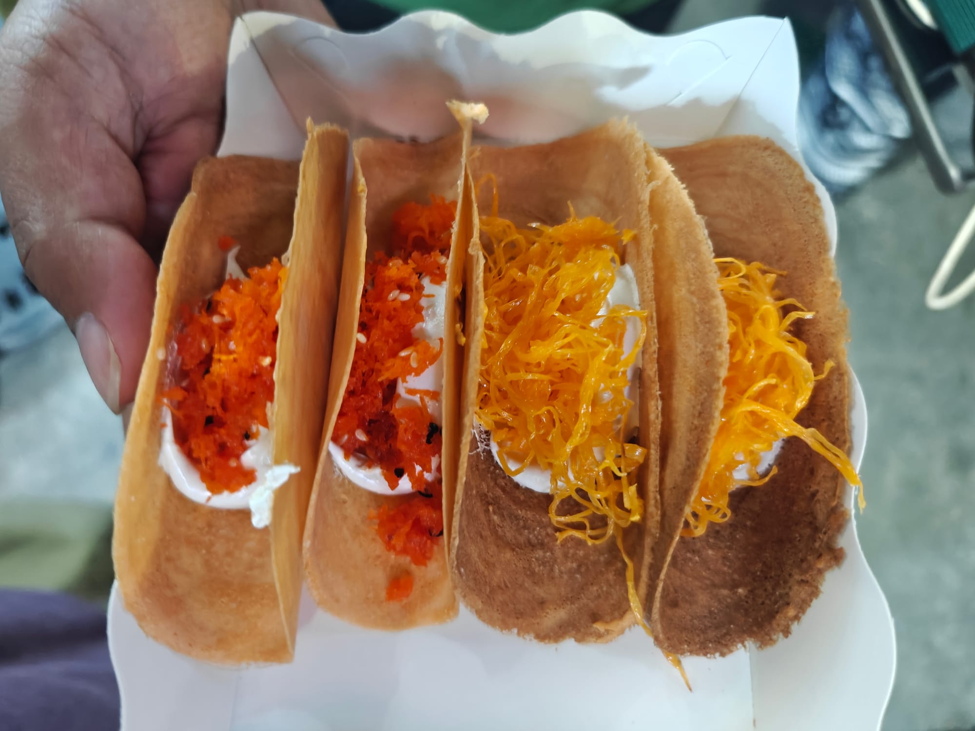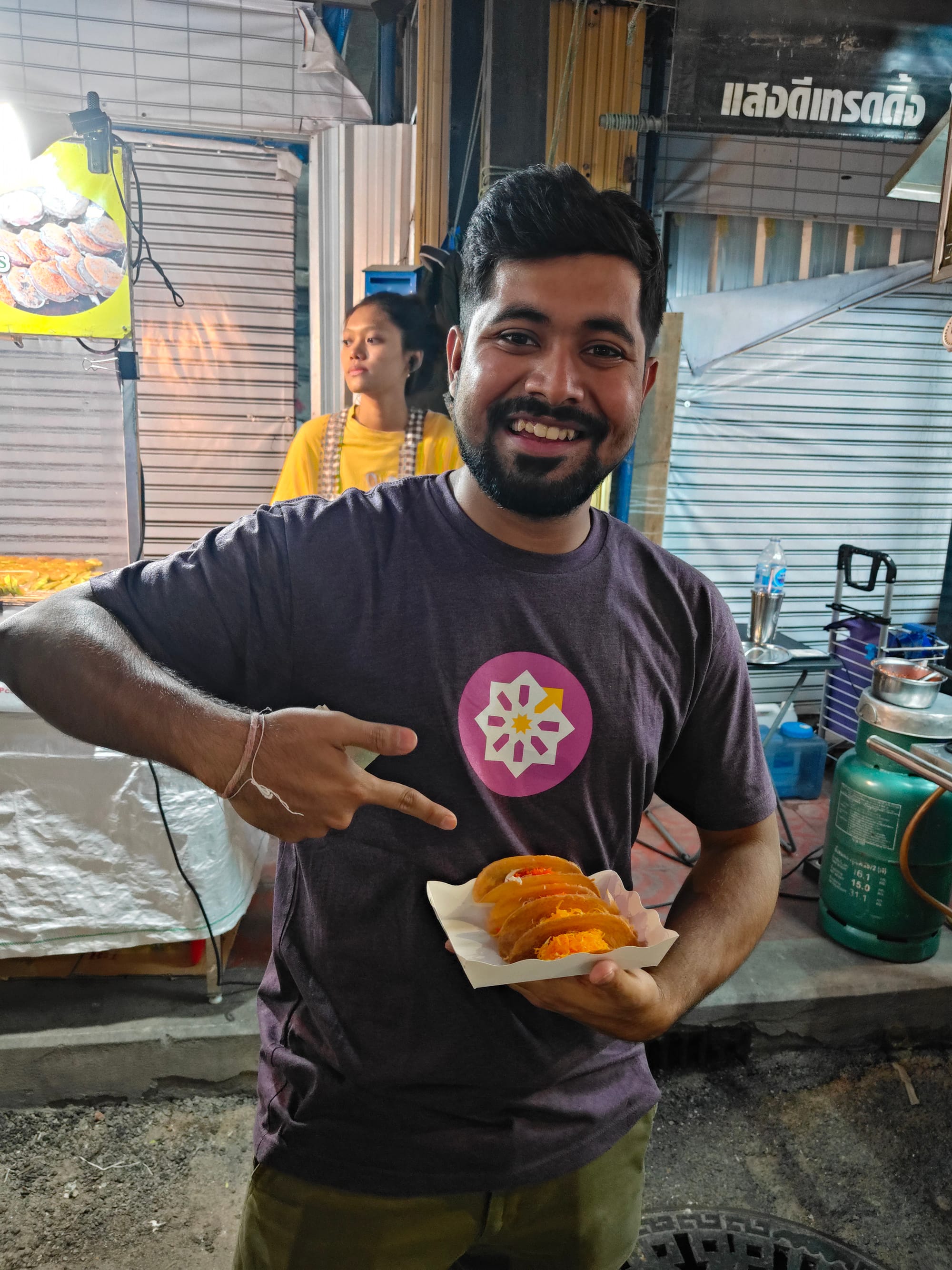 We dove deeper into our little roadside dining adventure with some Coconut Egg Sweet Crepes and Japanese Fried Octopus Balls before deciding to split into groups of two, as it did not sit right by Aaditya and myself, since the cuisines there were mostly non-vegetarian. As Samyak and Soundarya headed their way at around 0830pm Indochina Time, him and I decided to get even more creative by digging into some Shrimp Meat Dimsum Dumplings and Fried Crab Meat Rolls. After finishing off with some Fried Sweet Maple Fish and Ripe Alphonso Mango Slices, all for amazing bargains, we navigated the confusing pathways to reach Jam Jam Eatery Chinatown. As Aaditya's belongings were in my room, we left for the hotel at around 0915pm Indochina Time without waiting much longer. It was not that I had my fill of exploration, but I felt responsible to ensure he made it back safely at BTS Punnawithi to his hotel room. After hanging out in my hotel room and discussing industrial mentorship ideas, I decided to see him off and call it a day at around 1200am Indochina Time.