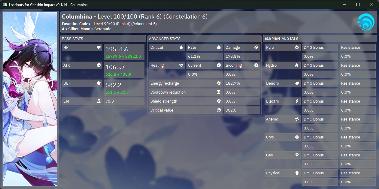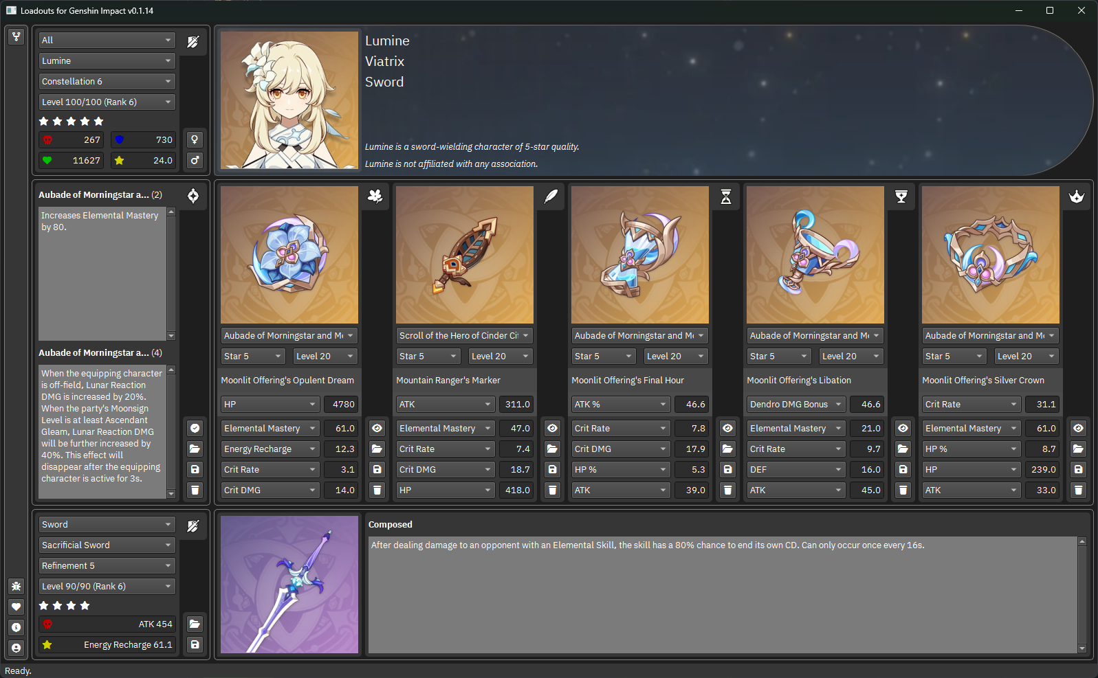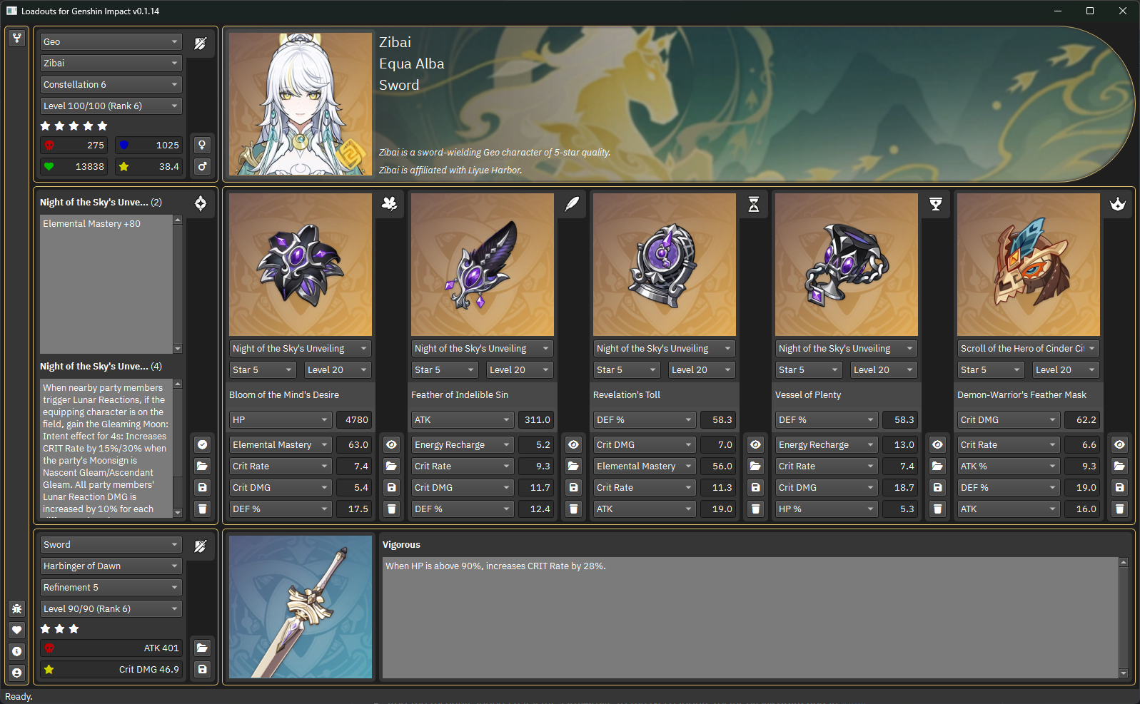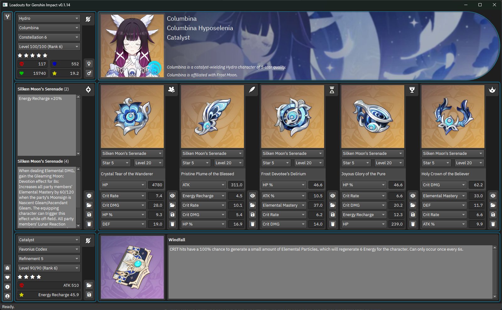 Loadouts for Genshin Impact v0.1.14 is OUT NOW with the addition of support for recently released artifacts like Aubade of the Morningstar and Moon and A Day Carved From Rising Woods, recently released characters like Columbina, Zibai and Illuga and for recently released weapons like Nocturne's Curtain Call and Lightbearing Moonshard from Genshin Impact Luna IV or v6.3 Phase 2. Take this FREE and OPEN SOURCE application for a spin using the links below to manage the custom equipment of artifacts and weapons for the playable characters.