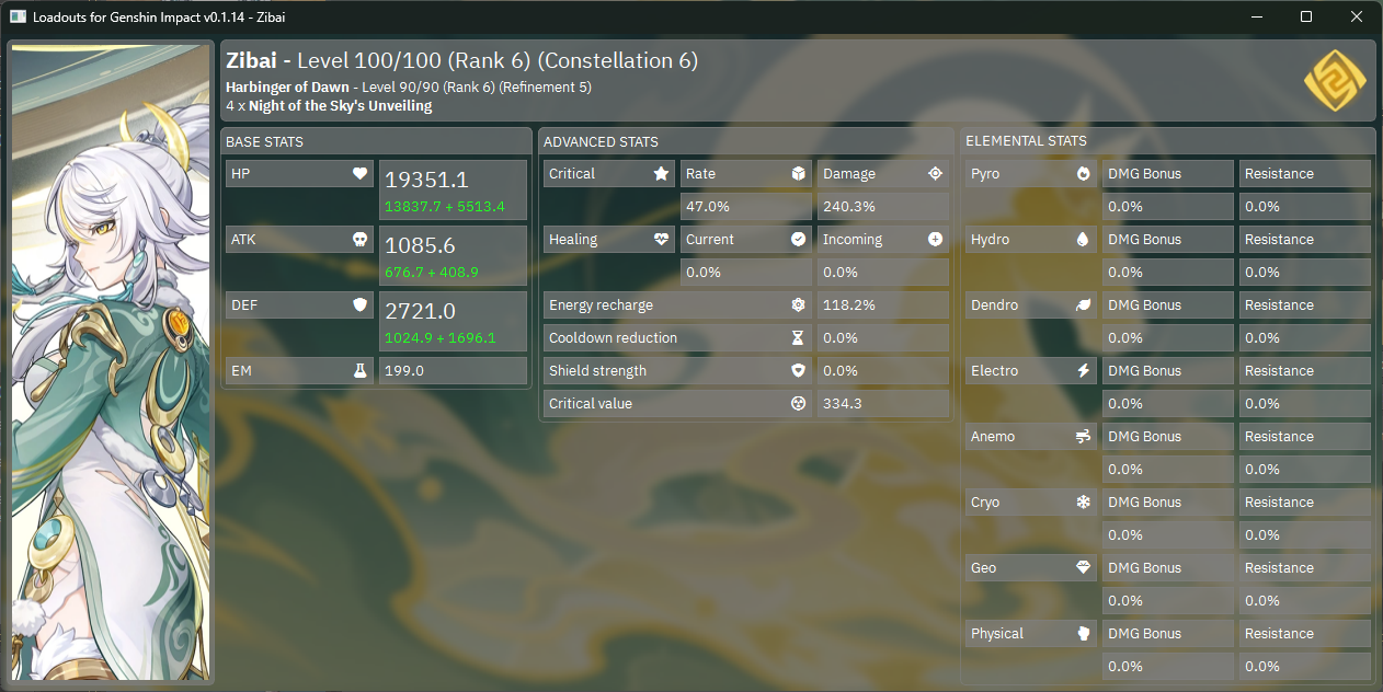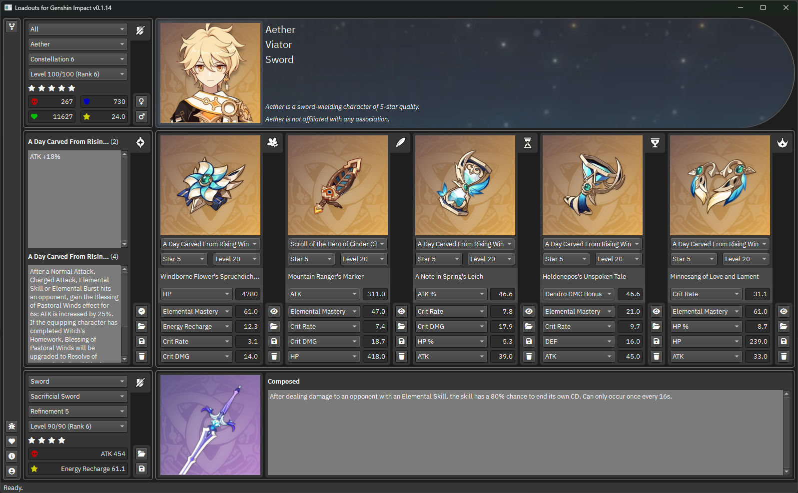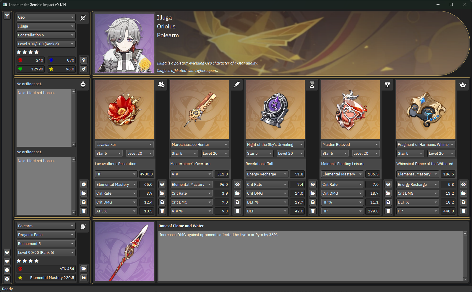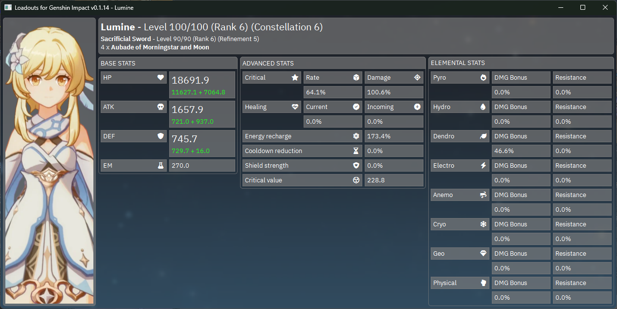 Loadouts for Genshin Impact v0.1.14 is OUT NOW with the addition of support for recently released artifacts like Aubade of the Morningstar and Moon and A Day Carved From Rising Woods, recently released characters like Columbina, Zibai and Illuga and for recently released weapons like Nocturne's Curtain Call and Lightbearing Moonshard from Genshin Impact Luna IV or v6.3 Phase 2. Take this FREE and OPEN SOURCE application for a spin using the links below to manage the custom equipment of artifacts and weapons for the playable characters.