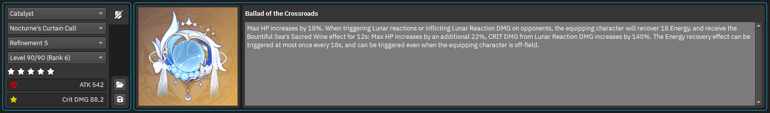 When the equipping character is off-field, Lunar Reaction DMG is increased by 20%. When the party's Moonsign Level is at least Ascendant Gleam, Lunar Reaction DMG will be further increased by 40%. This effect will disappear after the equipping character is active for 3s.